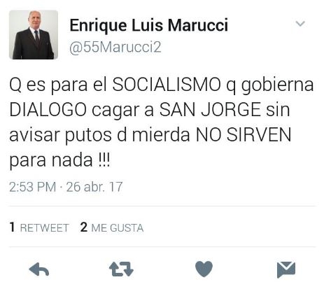 Enrique Marucci, se mostró enojado por un cambio de planes en materia de vialidad, tildó de “putos de mierda” a funcionarios del PS. La captura del twitter.