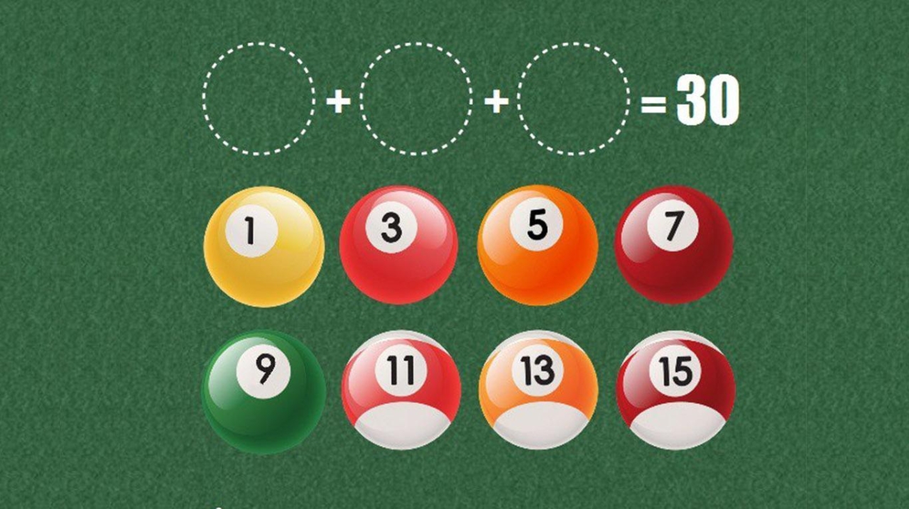 El reto tiene una consigna bastante sencilla: usar tres de las bolas de billar, sumarlas y que el resultado de treinta.