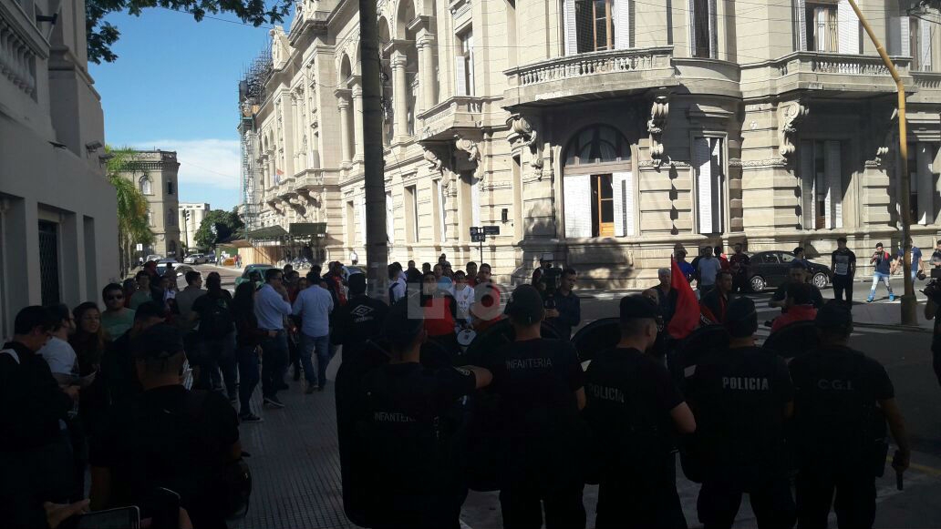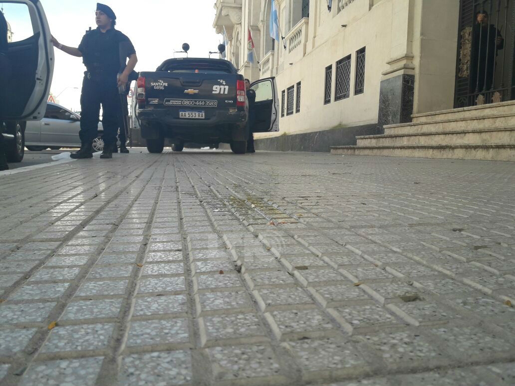 A las 13:50, el ex presidente del Club Colón Germán Lerche arribó al Palacio de Tribunales en una camioneta de la Policía de la Provincia, y bajo una intensa custodia.