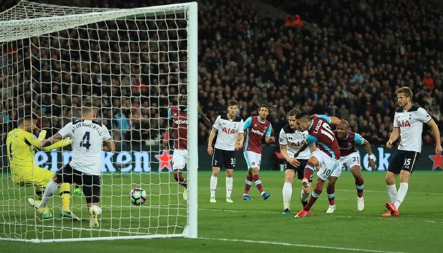 Manuel Lanzini convirtió el gol de la victoria para West Ham, que derrotó por 1-0 al Tottenham dirigido por Mauricio Pochettino y le complicó el panorama en la lucha por el título de la Premier League inglesa, a falta de tres jornadas para el final.