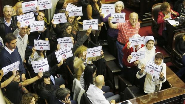 Al iniciarse la sesión especial para debatir un conjunto de tratados internacionales, la presidenta de la comisión de Derechos Humanos, Victoria Donda, solicitó la aprobación del tratamiento sobre tablas sobre los diversos proyectos de ley para “dar un contundente y claro mensaje a la justicia que en este país no vamos a renunciar a la memoria, verdad y justicia”.