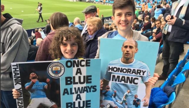 A través de varios carteles el público del City le brindó su respeto al jugador argentino, quien llegó al equipo de Manchester en 2008 y ahora continuará su carrera en el West Ham.
