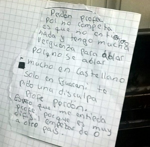 "Perdón profe por no completar. Es que no entiendo nada y tengo mucha vergüenza para hablar", comenzó relatando el chico en un trozo de papel que entregó junto a la prueba.