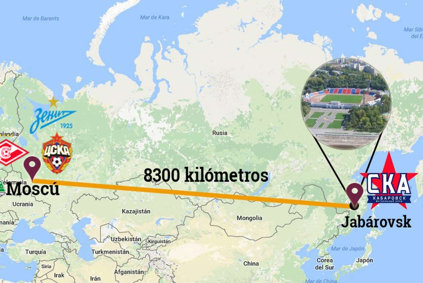 El FK Anzhí de Majachkalá es el que se encuentra más alejado de Jabárovsk: a ¡9.117 kilómetros de distancia! Es cuatro veces el trayecto entre Puerto Madryn y Posadas o Jujuy.
