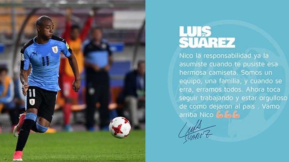 Luis Suárez consoló al juvenil Nicolás De la Cruz, futbolista de la selección uruguaya que expresó su dolor y se responsabilizó por la derrota de su equipo en el Mundial Sub 20 de Corea del Sur.