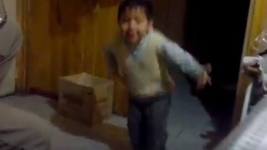 El nieto de Sergio Namuncurá, creador del grupo "Los Hermanos Namuncurá", grupo oriundo de Junín de los Andes, baila mientras su abuelo toca el acordeón y su padre Ezequiel los filma.