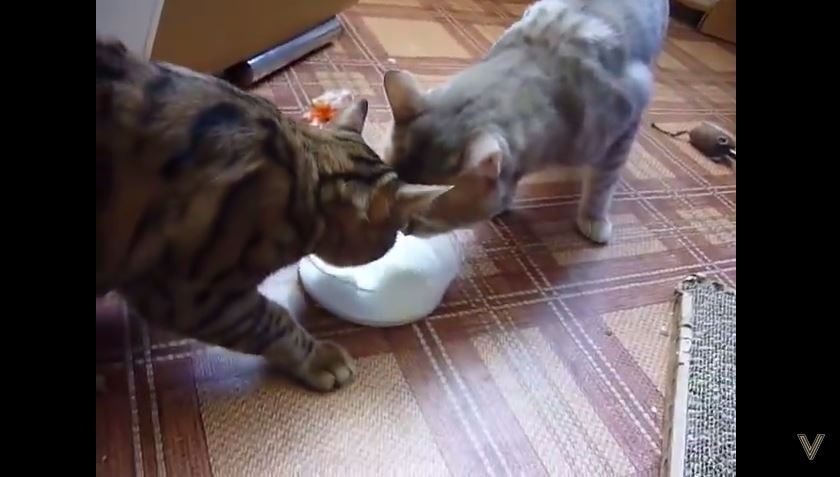 Irina Sinitsina, la dueña de estos simpáticos felinos, vive en Krasnoyarsk, Rusia, y no dudó en tomar la cámara y filmar la divertida escena de sus mascotas disputándose por el tazón de leche en común. El video, en cuestión de días, se hizo popular tanto en Facebook como en Youtube.