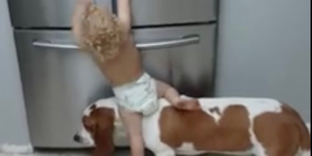 El pequeño Maverick quiere acceder a la heladera pero no llega, por ello usa a su perro como escalera para encaramarse a la nevera y coger algo de comer.