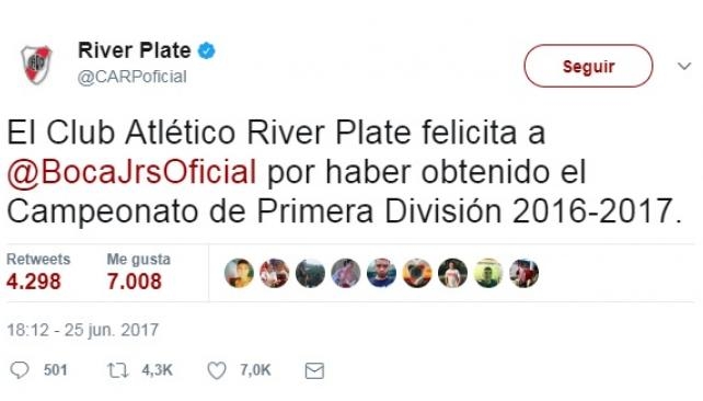 El Club Atlético River Plate felicita a @BocaJrsOficial por haber obtenido el Campeonato de Primera División 2016-2017.