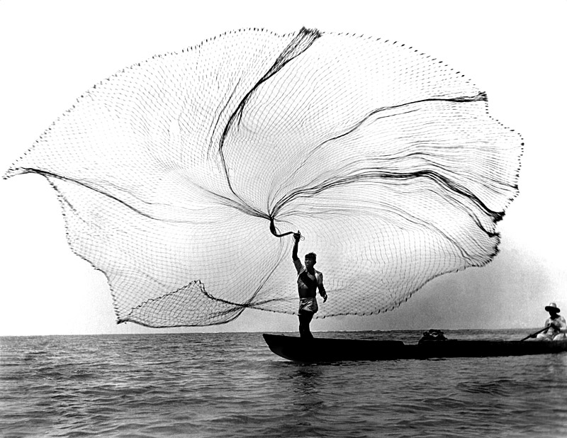 Para tomar su foto más célebre, Matiz no tuvo la necesidad de pedir poses, ni de entablar siquiera un diálogo con la dupla de pescadores retratados. Simplemente esperó, gatilló su cámara y en esa instantánea pudo captar de un modo singular una escena que se ha repetido, y se repite, todos los días desde tiempos inmemoriales. Sin embargo, pese a su cotidianeidad, la imagen se impone, nos interpela, nos atrapa. El pescador, sobre su canoa, lanza su atarraya al cielo y al agua. La red se despliega en una inmensidad que parece abarcarlo todo, trazando una parábola concéntrica que nos absorbe, que nos hipnotiza, que nos envuelve. Es el instante exacto antes de que la red se sumerja en el agua, y en esa línea de flotación subyace la belleza del gesto, del esfuerzo, de la providencia.