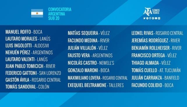La Asociación del Fútbol Argentino dio a conocer esta noche los 27 futbolistas que integran la primera nómina oficial de Nicolás Diez como entrenador del seleccionado Sub 20.