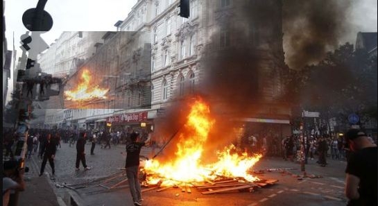 Coches ardiendo, 159 policías heridos, jóvenes encapuchados enfrentándose a vehículos antidisturbios, lanzamiento de cócteles molotov y agentes tratando de dispersar a los alborotadores eran las imágenes del día, en contraste con el correcto primer cara a cara del presidente estadounidense, Donald Trump, y el ruso, Vladímir Putin.