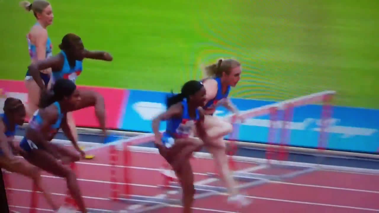 La deportista no sufrió lesiones graves pero no pudo terminar la carrera.Su compatriota, Kendra Harrison fue la ganadora de la prueba con un tiempo de 12.39 segundos, seguida por Sally Pearson.