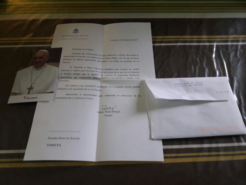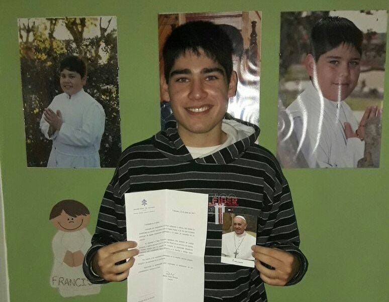 El chico contó que al leer el remitente que decía "Vaticano" pegó un grito que hizo asustar a su mamá. "No lo podía creer. Dentro del sobre había una foto del Papa. La carta está firmada por el asesor de la Secretaría de Estado, Paolo Borgia. Decía que el Papa había leído mi carta, me suplicó que rece por él y por el fruto de sus servicios, me dio la bendición apostólica y la hizo extensiva a toda mi familia".