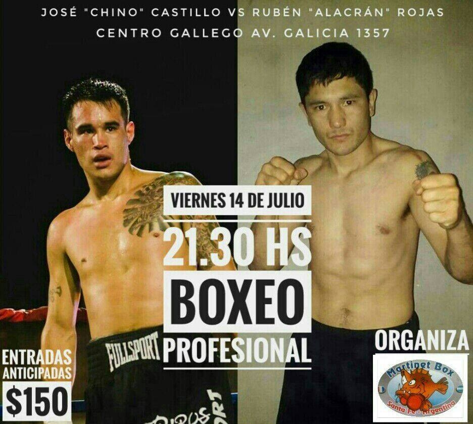 Este viernes, desde las 21.30, el Centro Gallego será escenario este viernes de un vestival de boxeo organizado por Martinet Box. La gran mayoría de las contiendas serán de carácter amateur, pero para darle un golpe de efecto, habrá una profesional, protagonizada por el santafesino José Chino Castillo (6-1, 5 KO), quien se medirá contra José Alacrán Rojas (4-9-1, 1 KO) de San Jorge.