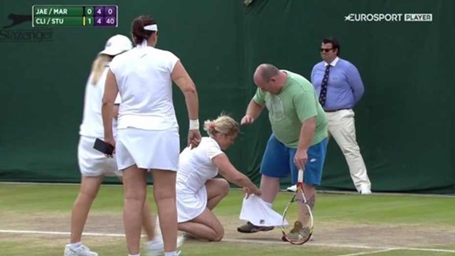 Si hay algo que se respeta en Wimbledon es la tradición y acorde a eso Clijsters no tuvo mejor idea que acercarle el vestuario al jugador, que se vistió de falda, al igual que el resto del equipo, y protagonizó un momento tan épico como divertido, con más de 1,5 millones de reproducciones en YouTube.
