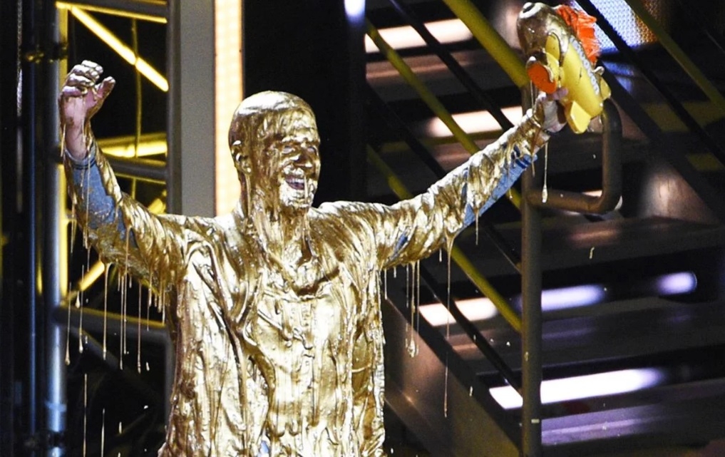 La costumbre es lanzar a los ganadores un líquido que, por lo general, suele ser verde fluo. Sin embargo, en este caso, se cambió por un líquido dorado para que parezca oro. Michael lo sabía, y cuando fue galardonado subió al escenario con un cambio de vestuario, evitando ensuciar su pantalón blanco y saco de primera marca. Tuvo oportunidad también de decir unas pequeñas palabras de agradecimiento, pero no mucho más, porque rápidamente terminó empapado de pies a cabeza, protagonizando uno de los momentos más divertidos de la ceremonia.