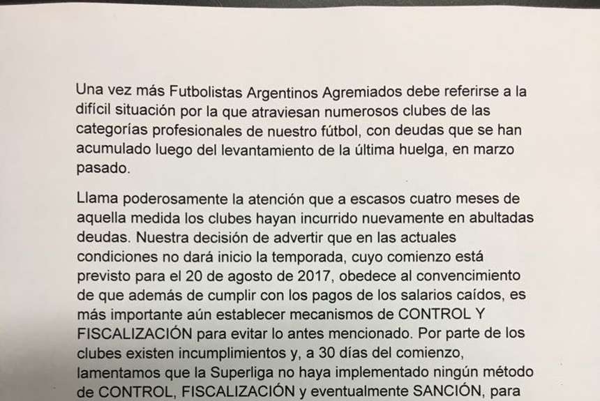 Con su titular a la cabeza, Futbolistas Argentinos Agremiados reiteró que el torneo no arrancará el próximo 20 de agosto si persisten las deudas y pidió a los clubes y demás autoridades por mecanismos de "control, fiscalización y sanción"