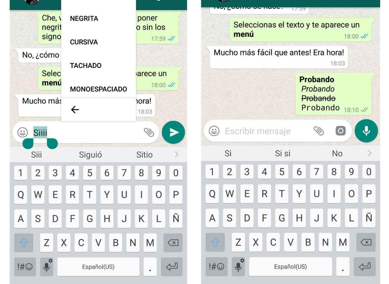 En la versión 2.17.148 lo único que tenés que hacer para cambiar el formato del texto es mantener el dedo pulsando sobre el texto que escribiste, apretar en "Seleccionar todo" y después desplegar el menú que te aparecerá en la pantalla. Ahí estarán los cuatro formatos disponibles: negrita, cursiva, tachado y monoespacio.