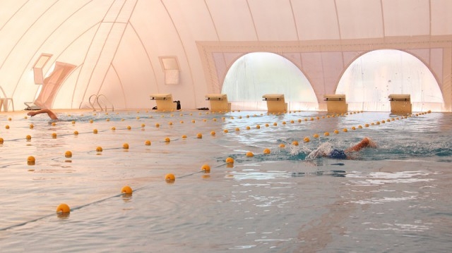 El sistema de la pileta techada consiste en una cubierta inflable de lona plástica de poliéster translúcida que permite el pasaje del sol y luz en todo el recinto, recubierta por PVC en ambos lados para brindarle aislamiento hidrófugo y protección UV al hilado. Está sustentada por la presión de un ventilador centrífugo que provee la presión de inflado para soportar el peso de la cubierta. Además cuenta con un ventilador auxiliar que opera durante la noche sustituyendo el ventilador principal para economizar electricidad y permitir que el principal descanse por unas horas.