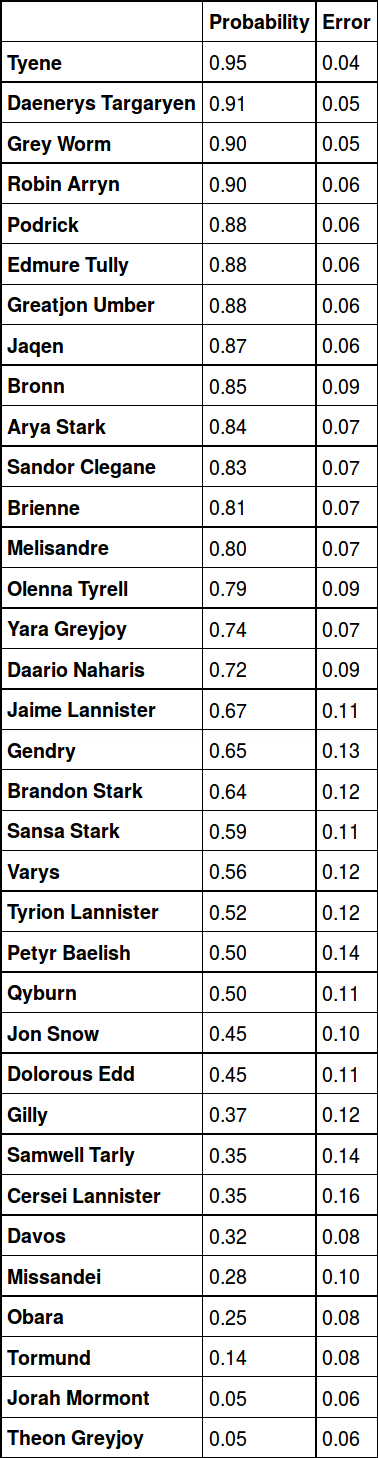 El algoritmo ha tenido hasta ahora un 74% de éxito en sus predicciones sobre las muertes en la sexta temporada. De momento el modelo predice que Daenerys Targaryen tiene una de las mayores probailidades de morir (0.91), Tyrion Lannister tiene un 0.52, y aparentemente Theon Grejoy es el personaje que está más a salvo, con apenas un 0.05 de probabilidad de morir.