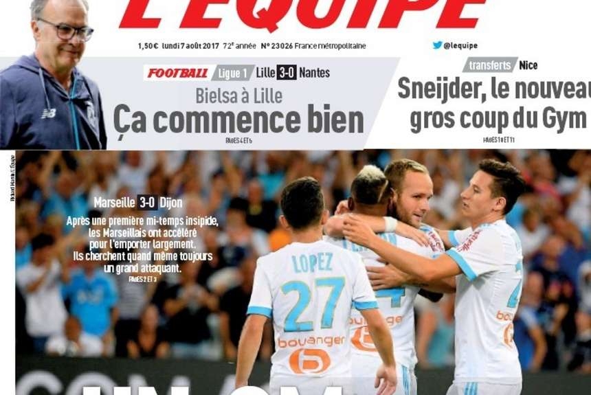 El famoso diario L'Equipe puso al Loco en su portada, como segundo tema en importancia. Y en el equipo ideal de la primera fecha, incluyó a Bielsa como el mejor entrenador.
