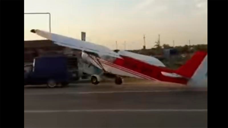 El particular hecho ocurrió en Chechenia y fue captado por la cámara de un testigo ocasional que luego subió el video a través de las redes sociales. Las imágenes muestran a un pequeño avión que comienza a acelerar para comenzar con las maniobras de despegue, pero en el intento se estrelló contra un auto detenido que estaba esperando el semáforo.