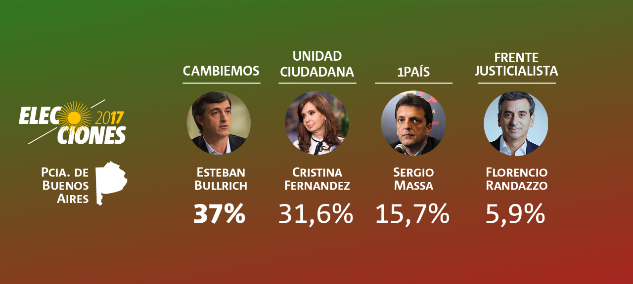 En la provincia de Buenos Aires los primeros datos arrojan que el precandidato oficialista a senador Esteban Bullrich obtiene el 37 % de los votos, por encima de Cristina Kirchner para Unidad Ciudadana con el 31,6% y de Sergio Massa con el 15,7%.