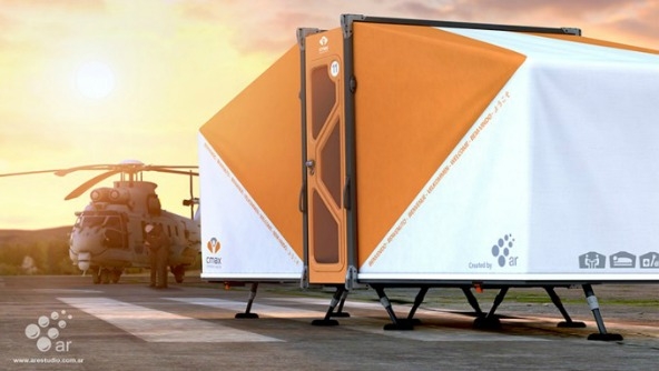 El Cmax System, nombre que recibió el habitáculo en honor a su hermano, cuenta García, está hecho con polipropileno, aluminio y tela de poliéster, y trae además un adicional de tres baños que se puede colocar cada tres módulos y un kit de supervivencia provisto con comida, agua, lápices y cuadernos.