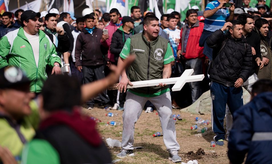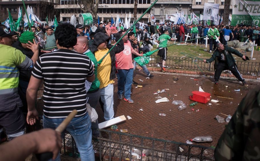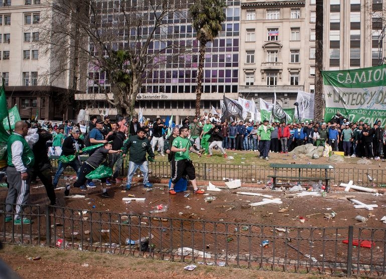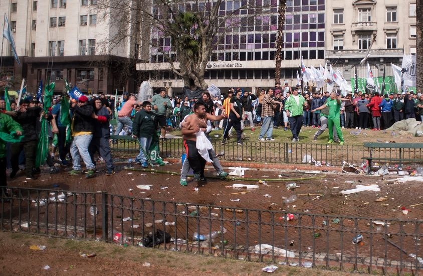 Antes del discurso principal, integrantes del sindicato de Camioneros protagonizaron incidentes. Volaron palos, piedras y hasta las cruces de madera que están en Plaza de Mayo en homenaje a ex combatientes de Malvinas.