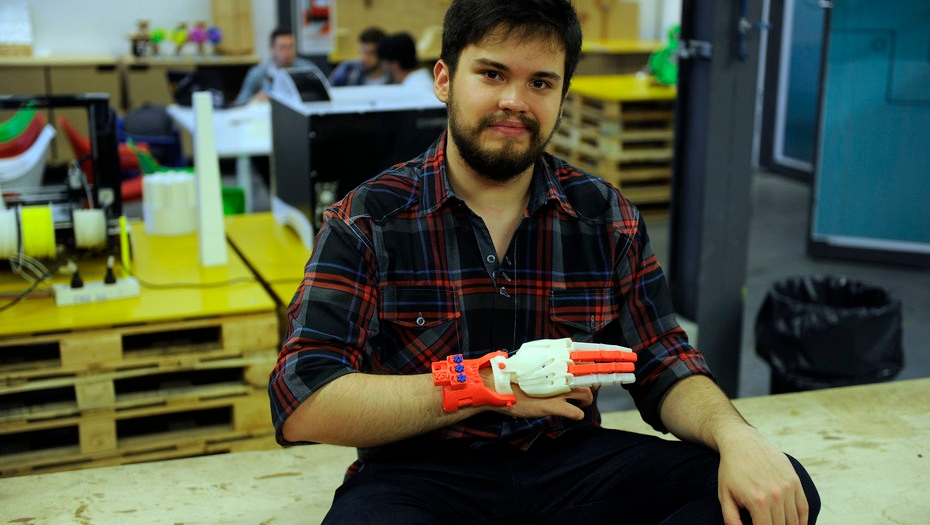 El taller de Atomic Lab es un salón de 200 metros cuadrados en un primer piso al que se accede por una escalera, una mezcla de oficina cool -espacios abiertos, sillones, mesas de trabajo compartidas- con espacio autogestionado -estantes hechos con cajones de verduras pintados de colores y bancos armados con pallets-. Hay un banner azul que dice MANOTON (así se llaman sus maratones de entregas de prótesis) y sobre una pared alguien pegó unas decenas de post-it de colores con agradecimientos de personas que recibieron su mano. Desde el ventanal se ven los galpones de la Avenida Chiclana. Sobre los vidrios que alguien usó como pizarrón quedaron los restos de unas fórmulas borroneadas.