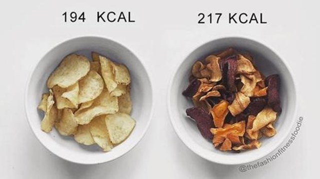 ¿Patatas fritas a la vinagreta o un snack de vegetales crujientes? En ambas tazas hay 40 gramos de producto, pero el recipiente de la derecha contiene más kilocalorías. Una vez más, la opción meno sana es la que muchos habrían pensado que se adapta mejor a una dieta para perder peso.