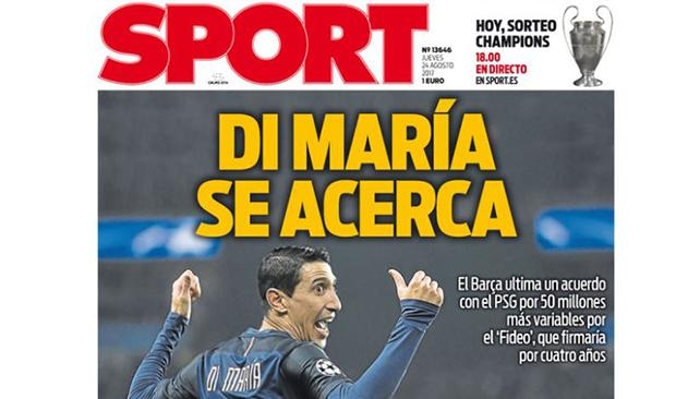 "Barcelona está a punto de cerrar el fichaje de Ángel Di María. El acuerdo con el jugador es total y el PSG ha accedido a venderlo por una cifra cercana a los 50 millones de euros". El sitio catalán Sport arriesga que el argentino será el próximo fichaje blaugrana y lo llevó a la primera plana de su portada del jueves.