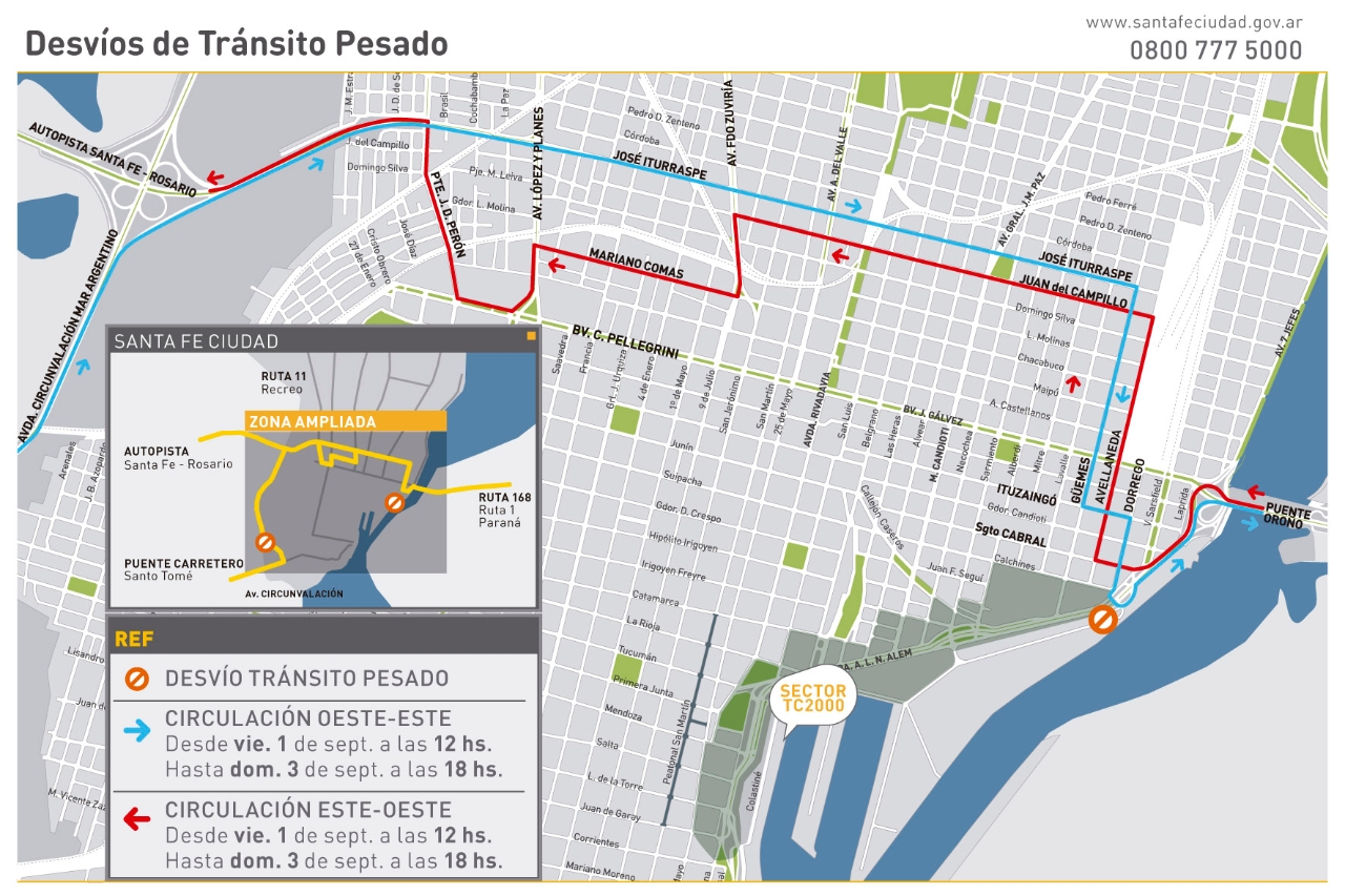 Con el cierre total del circuito, se pondrá el marcha el desvío del tránsito pesado, el cual estará vigente hasta finalizada la competencia el domingo. De esta manera, los camiones que ingresan habitualmente a la ciudad por la Autopista Santa Fe-Rosario y realizan su trayecto por Circunvalación Oeste tendrán que desviar por calle Iturraspe, tomar posteriormente Güemes, luego Ituzaingó y Dorrego hasta avenida Alem, a recorrido habitual.