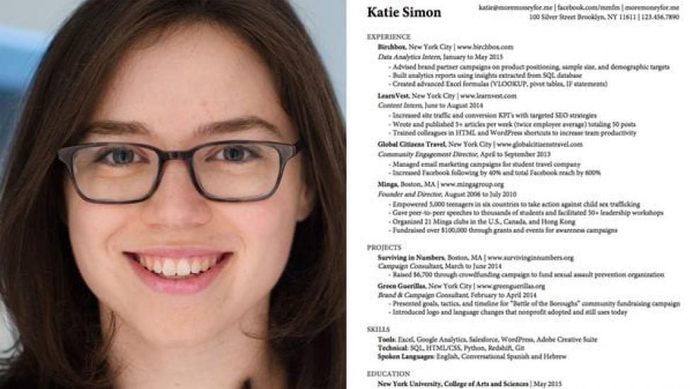 En los últimos años de su carrera universitaria, Katie Simon fundadora del more Money For Me logró elaborar el CV perfecto capaz de convencer de brindarle una entrevista laboral a una veintena de multinacionales entre ellas Google y BuzzFeed.