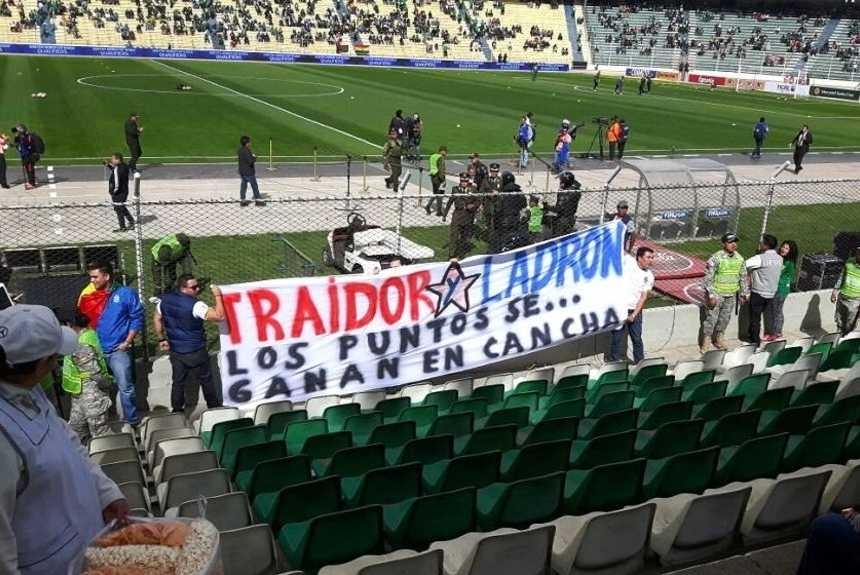 Ahora, bolivianos y chilenos se volvieron a ver las caras y un grupo de hinchas de Bolivia, enojados por el fallo, llevaron una bandera en contra de Chile. ¿Qué decía? "Traidor y ladrón. Los puntos se ganan en la cancha...", así se expresaron