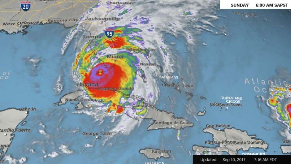 Irma se encontraba a 24 kilómetros de Cayo Hueso en las primeras horas del domingo con vientos sostenidos de 210 kilómetros por hora. Avanzaba hacia el noroeste a una velocidad de 10 kilómetros por hora y se esperaba que pasara por los Cayos de la Florida entre las 7 y las 8 de la mañana, hora local.