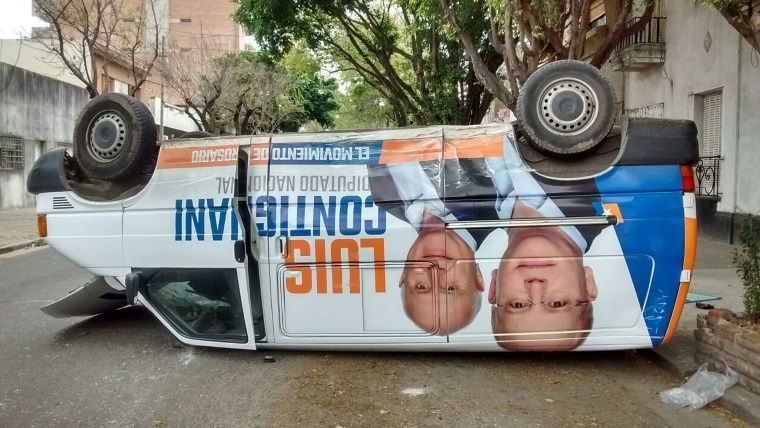 En uno de los costados de la camioneta volcada están impresas las imágenes del gobernador Miguel Lifschitz y del candidato a diputado nacional Luis Contigiani. En el otro, la foto del postulante a concejal de Rosario, Pablo Javkin.