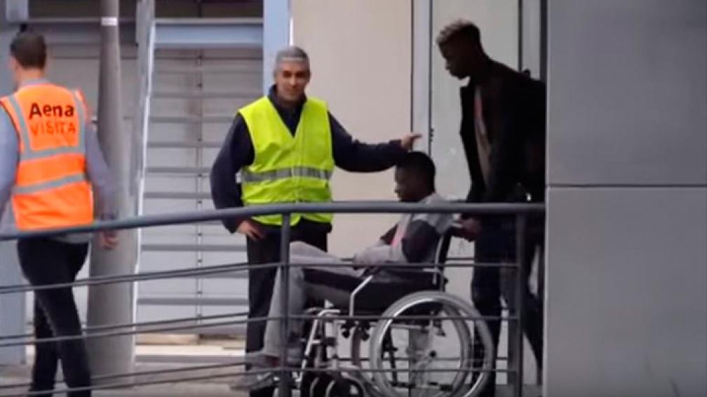 El jugador, que estará de baja entre tres y cuatro meses según el primer pronóstico de los servicios médicos del club catalán, se fue hacia el Aeropuerto en silla de ruedas y la imagen llamó la atención.