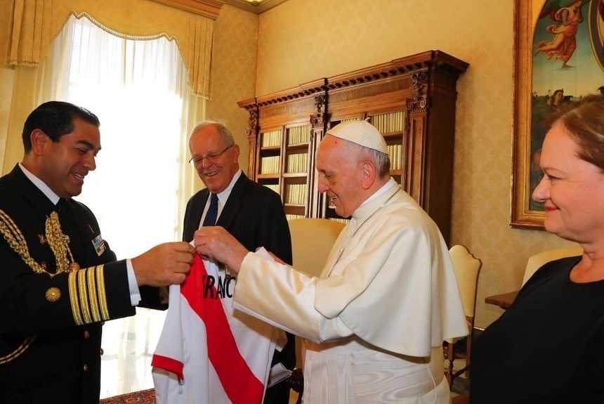 El Papa Francisco recibió este viernes al presidente de Perú, Pedro Pablo Kuczynski, en parte de una visita oficial. El jefe de Estado, como suele ocurrir en estos casos, le regaló una camiseta de la selección de su país.