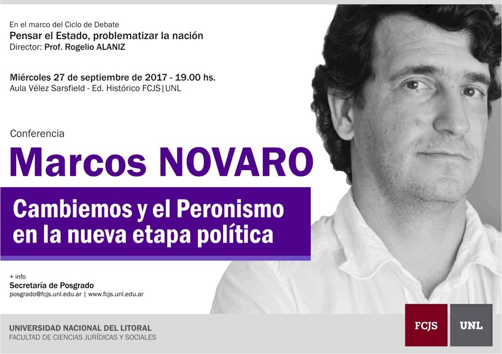 El miércoles 27 de septiembre se realizará un nuevo encuentro del Ciclo de Debate “Pensar en el Estado, problematizar la nación” de la Facultad de Ciencias Jurídicas y Sociales (FCJS). Será a las 19, en el aula Vélez, y contará con la presencia de Marcos Novaro, quien dará una conferencia titulada "Cambiemos y el peronismo en la nueva etapa política".