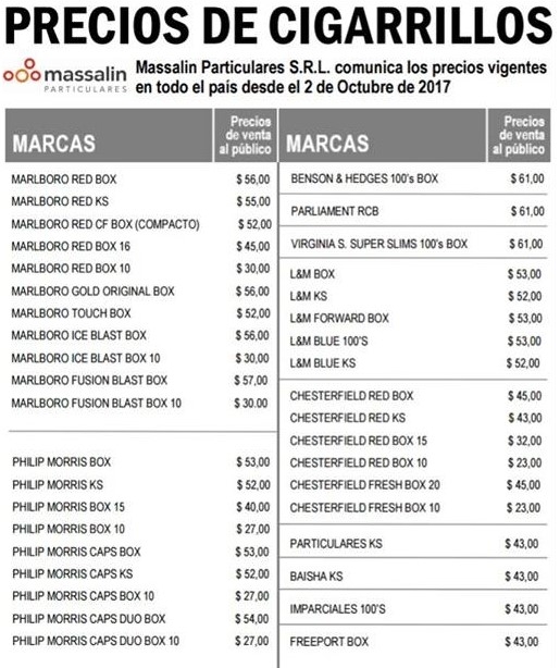 La suba abarcará a todos los atados de la tabacalera Massalin Particulares y de su rival, la British American Tobacco Argentina (ex Nobleza Piccardo). Las marcas afectadas serán prácticamente todas, desde Marlboro, Philip Morris, L&M, Chesterfield, Benson & Hedges, Particulares, Parliament, Imparciales y Virginia Slims, hasta Camel y Lucky Strike.