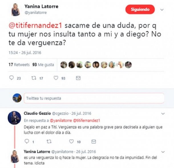 Beto mostró el tuit de julio de 2016 de Yanina arrobando a Tití: “Es una vergüenza lo que hace la mujer. La desgracia no te da impunidad. Fin del tema. Idiota”.