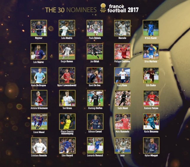 The 30 nominees for the 2017 Ballon d'Or France Football ! #ballondor pic.twitter.com/TBRQwRvo4E