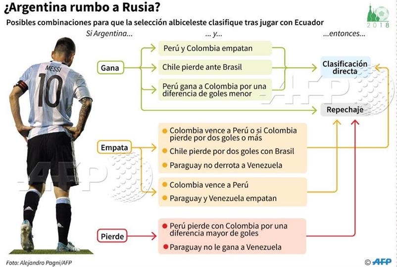 La selección argentina se juega ante Ecuador (esta noche, desde las 20.30) su última gran chance de ir al Mundial Rusia 2018. Un triunfo le asegurará jugar, al menos, el repechaje. Pero incluso hasta una derrota puede dejarlo en carrera, dependiendo de los otros resultados. ¿Cuáles son las combinaciones que le sirven al equipo de Jorge Sampaoli para llegar a la Copa del Mundo?