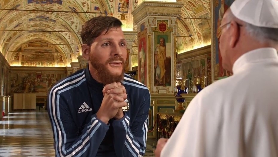 Parodiando a Lio Messi y el ex DT Carlos Bilardo, el cómico llega hasta el Vaticano para que el papa Francisco haga "el milagro".