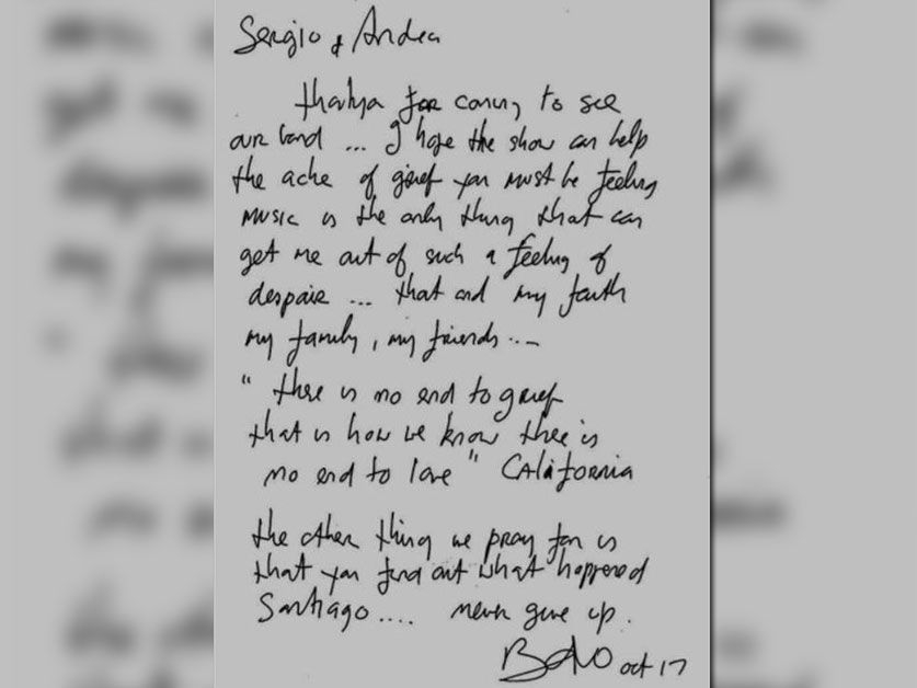 “Lo otro por lo que rezamos es porque puedan descubrir lo que le pasó a Santiago. Nunca se rindan”, concluye la carta escrita de puño y letra Bono.