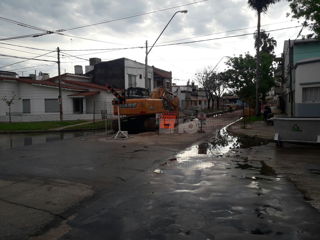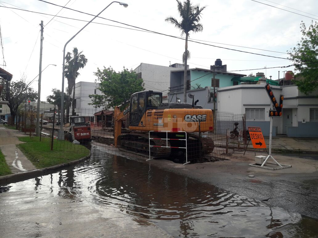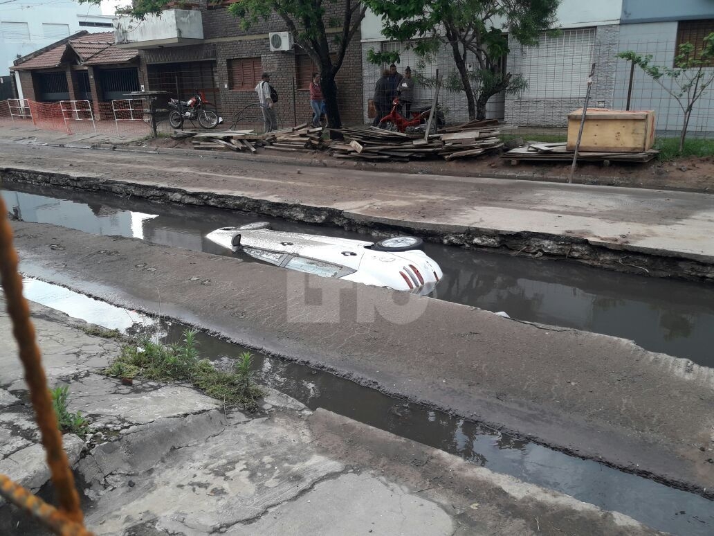 El conductor de un Fiat Bravo no vio la señalización y los alertas sobre una obra de desagüe y su auto comenzó a flotar porque se había terminado el pavimento.
