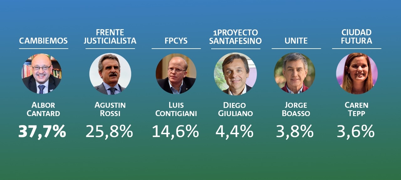 Escrutadas el 99,39 por ciento de las mesas, los resultados oficiales proporcionados por la provincia hasta ahora son los siguientes: Cambiemos, 37,78%; Frente Justicialista, 25,85%; Frente Progresista Cívico y Social, 14,63%; Un proyecto Santafesino, 4,49%; Unite, 3,84%; Ciudad Futura, 3,63%; Popular, 3,20%; Frente Social y Popular, 2,72%; Frente de Izquierda y los Trabajadores, 2,20%; y Espacio Grande, 1,66%