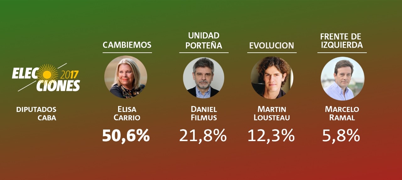 En esta categoría, Elisa Carrió ratificó el triunfo de la primera elección y gana con el más del 50% de los votos, seguida por Filmus de Unidad Porteña con 21,73% de los votos. En tercer lugar se ubica Martín Lousteau, desde su espacio "Evolución" con un poco más del 12% del electorado.